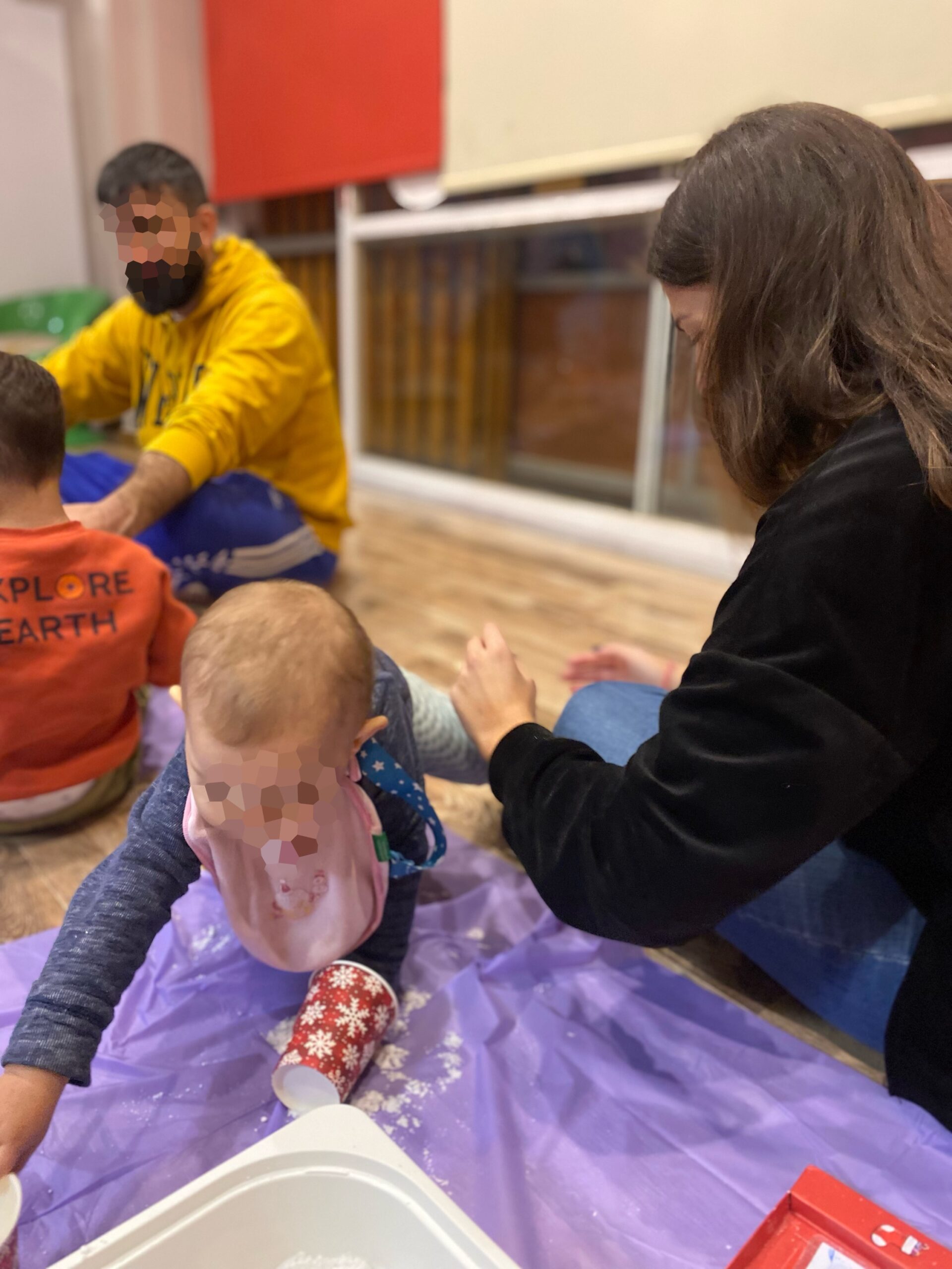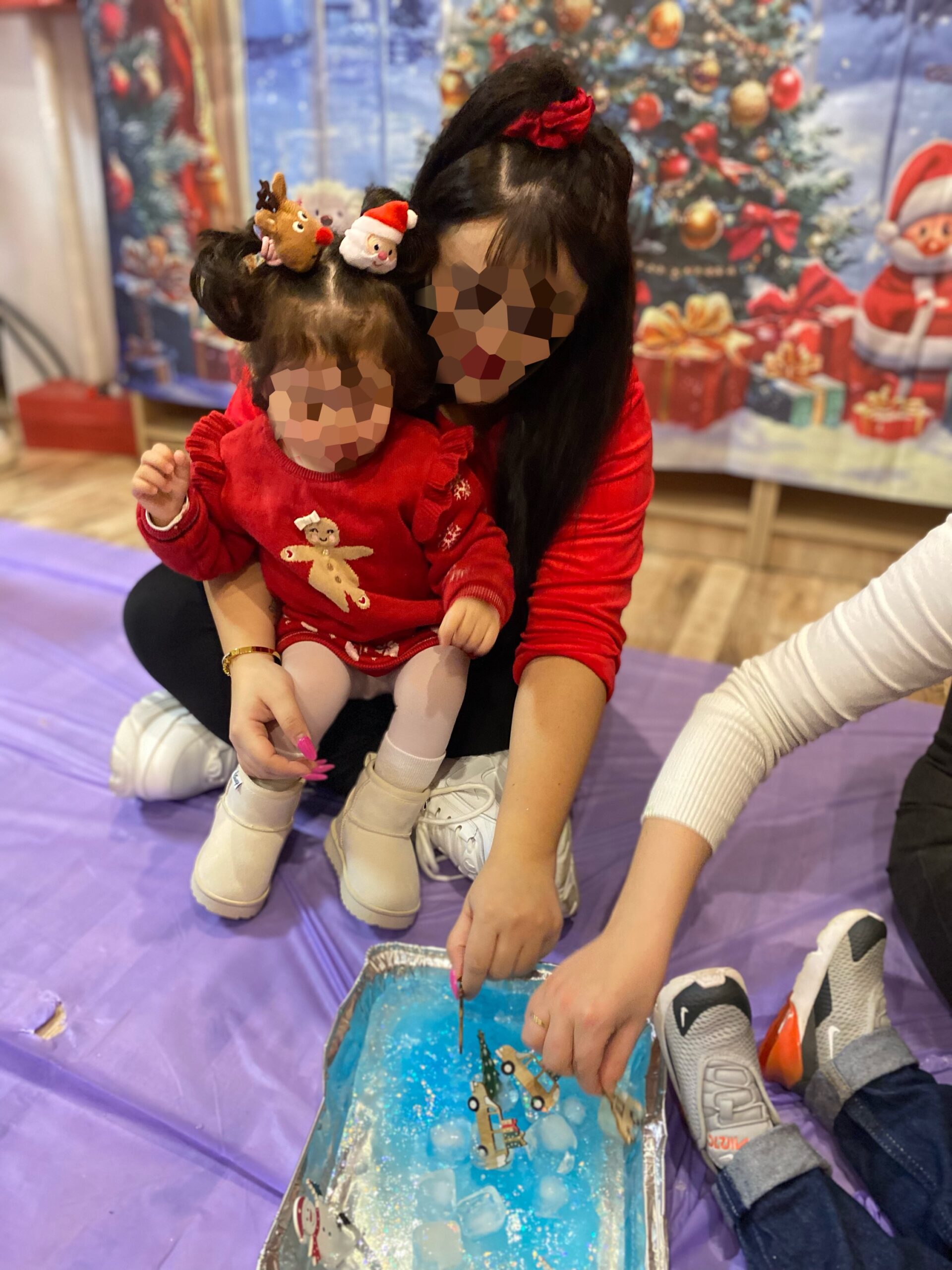 Μέσα από παιχνίδι με βρώσιμο χιόνι, αναζήτηση κρυμμένων αντικειμένων μέσα σε χρωματιστό ρύζι, παιχνίδι με oobleck, παγοδρόμιο φτιαγμένο από αληθινό πάγο, καθώς και τη δημιουργία αναμνηστικού με βρώσιμες δαχτυλομπογιές, τα παιδιά είχαν την ευκαιρία να πειραματιστούν με υλικά, υφές και χρώματα σε ένα ασφαλές περιβάλλον. Στο τέλος, μας επισκέφθηκε ο Άγιος Βασίλης όπου μοίρασε δωράκια σε όλα τα παιδιά.
